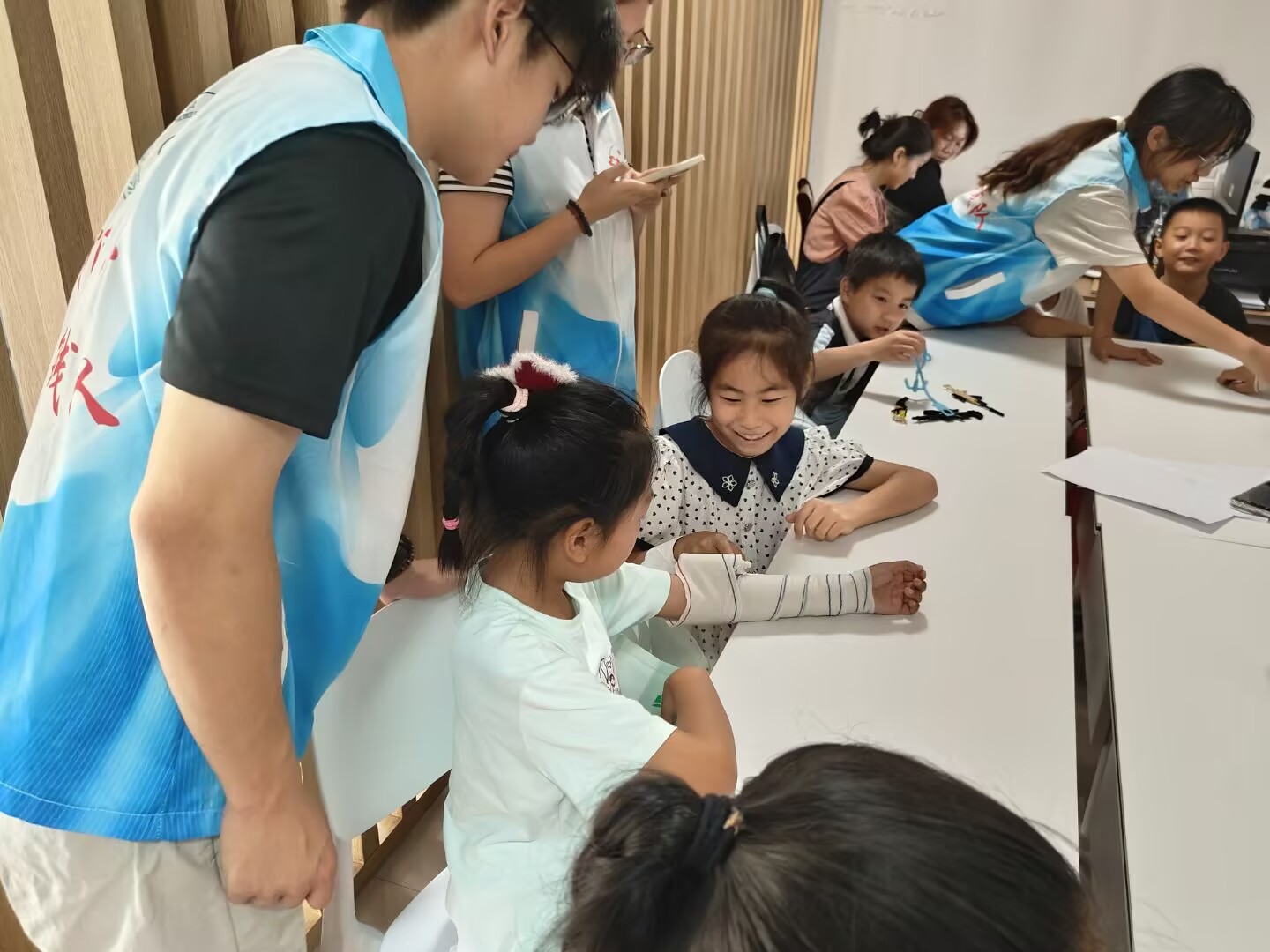 随后,急救知识和包扎技巧教学将活动推向高潮。学生团队采用通俗易懂的语言,结合日常生活场景,讲解了海姆立克急救法、心肺复苏的基本步骤、常见伤口的处理方法等。包扎技巧教学中,学生们亲自示范不同部位伤口的包扎方式,小朋友们认真学习,积极上手实践,现场气氛热烈。