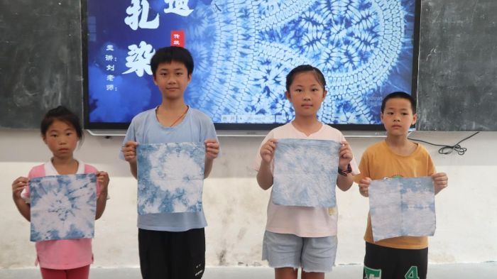 过程中,学生分组创作,作品涵盖几何纹样、自由纹理等类型,部分作品融入当地瑶族传统图案元素。活动结束后,所有成品统一晾晒,用于后续校园文化展示。