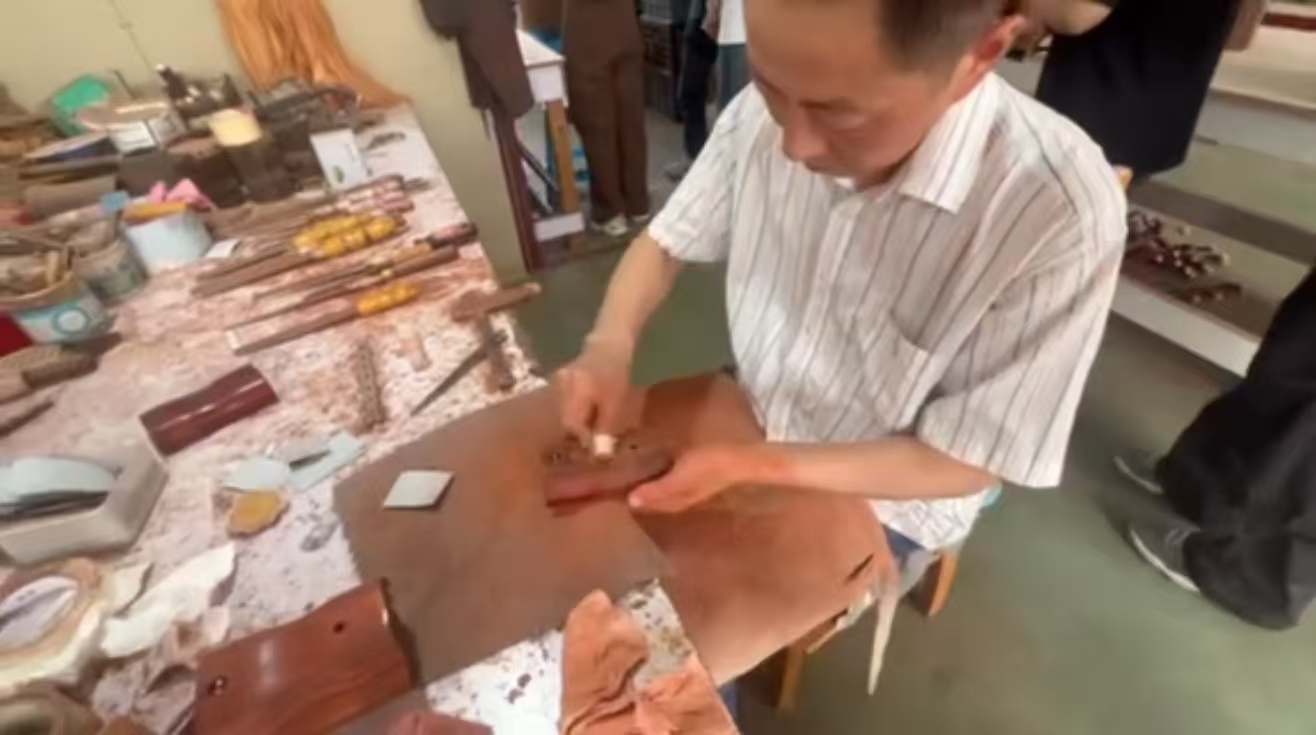 “南国赵氏琴,古韵天外来”,团队成员们走进二胡工坊,触摸非遗温度。团队成员们围站在工作台前,手中握着砂纸,小心翼翼地打磨着初具雏形的红木琴杆。顺着木纹走,力道要匀,就像给木料‘按摩’,才能让它后续发音更通透。摊开着蟒皮、琴轴、弓杆等配件,从选料时需存放三年以上的老红木,到蒙皮时要精准测量的张力数值,再到定音时反复调试的音准刻度,每一个细节都藏着“百工百法”的古老智慧,正如赵军老师说的:“手艺活的精细要求和灵活程度是机械无法实现的。机器能复制形,但刻不进魂,二胡的魂是匠人的手给的。”此外,团队成员们通过触摸蟒皮,制胚等方式更加深入了解二胡的魅力。这场制作体验,让团队成员们跳出“乐器”的表层认知:二胡不仅是两根弦、一把弓的组合,更是材质、工艺、声学与文化的共生体。它的音色里有木料的年轮,它的技法中含着手艺的温度,它的旋律里藏着民族的情感。亲手触碰过它的“诞生”,才真正读懂:所谓非遗传承,正是让每一道工序里的智慧、每一次打磨中的坚守,都能随着弦音,代代相传。