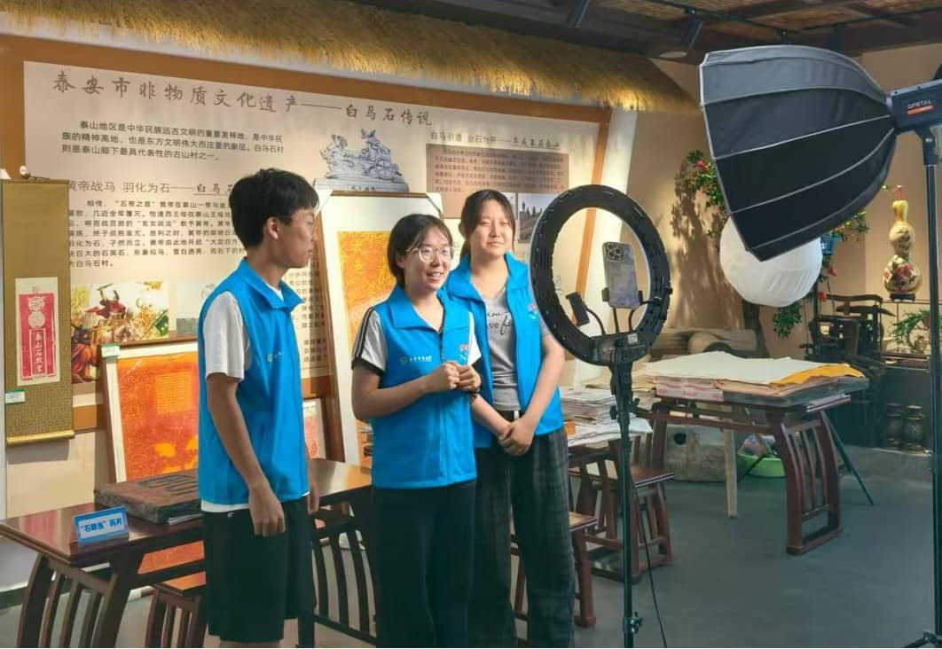 当日下午,团队走进红色文化展厅参观,珍贵的史料、泛黄的照片,串联起泰安本地的红色记忆。随后,围绕泰安非物质文化遗产“白马石传说”,团队开启直播活动。镜头前,成员们以故事为载体,生动拆解传说中蕴含的文化内涵与爱国精神,将传统文化传承与爱国主义教育创新融合。“希望通过直播,让更多人了解家乡文化,从本土故事里汲取爱国养分。”团队成员面对镜头,道出直播初衷。当直播数据不断跳动,众多网友在线互动,团队知道文化传承的种子已借由网络播撒。本次直播引得上千人观看,在专业人员解答和队员的协助下,更多人了解了“拓印”这项非物质文化遗产。为保证调研的实时性,团队当晚召开小组会议,复盘当日行程、梳理次日与当地领导交流要点,为后续实践精准蓄力。