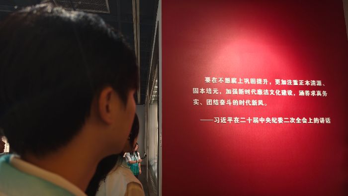 贤彰廉风展区,移民干部张兰权“三拒搬迁补偿款”的事迹、古代清官“一钱太守”刘宠的操守,引发队员对金融岗位利益诱惑的反思;