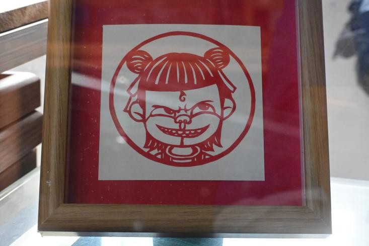 在聆听一段时间的讲解后,我们对剪纸的技术与表现方式初有了解,但当“谷子”这个词从老师口中吐出时,不免惊讶。“谷子”正是现在年轻人追求喜爱影视作品的周边产品,“我想把剪好的剪纸放进谷子里,这样年轻人也喜欢,我们也能让更多人了解剪纸”,随后董老师从手机壳里拿出来一个精巧的“哪吒”,又让我们眼前一亮。传统节气、核心价值观、冬奥会、抗疫故事,甚至热门的影视作品都在剪纸人手里被玩出花来。