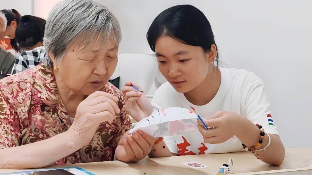 图为志愿者指导老人绘制脸谱。戴菁岑供图