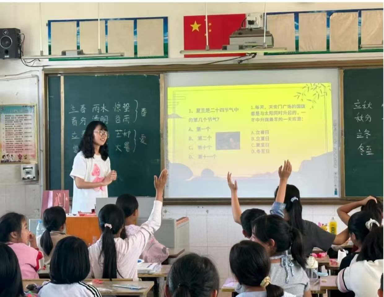 宜良的活动以“民俗与经典交融”为核心,让青少年在沉浸式体验中触摸文化温度。志愿者们首先邀请当地非遗传承人带领学生学跳彝族舞蹈,孩子们跟着明快的节奏,摆动着象征丰收的手势,在旋转跳跃中感受彝族“火把节”所传递的热情与团结。“春分麦起身,一刻值千金”,在“二十四节气课堂”上,志愿者通过动画短片解析节气与农耕、生活的关联:从清明扫墓祭祖的孝道传承,到冬至吃汤圆的团圆寓意,一个个生动案例让抽象的时间智慧变得可知可感。诗歌鉴赏环节更成了“文化加油站”,志愿者以李白的《静夜思》为引,讲解“月亮意象”的思乡内涵,随后鼓励孩子们提笔创作,稚嫩的诗句里,藏着传统文化浸润的诗意。此外,“全球文化多样性”分享课上,志愿者对比彝族刺绣与墨西哥刺绣的异同,引导学生理解“各美其美,美美与共”的包容理念。