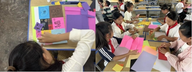 在墨香萦绕的传统文化课堂中,志愿者们带领孩子们执笔绘制“百福图”。在不同颜色的彩纸上,小书法家们屏息凝神,一横一竖摹写百态“福”字——从古朴庄重的“福”到生动可爱的“福”,方寸之间尽显汉字的古韵和灵动性。孩子们边聆听“福”文化典故,边将祝福倾注笔端:为父母祈安康,为家乡绘丰年,为祖国书昌盛。当无数形态各异的福字最终汇聚成绚烂的祝福图腾,课堂化作流淌的温情河川。这堂“以笔承愿,以福连心”的手工课,不仅让书法之美扎根乡土,更以汉字为媒串起代际情感,在方纸叠嶂间筑牢文化认同的基石。