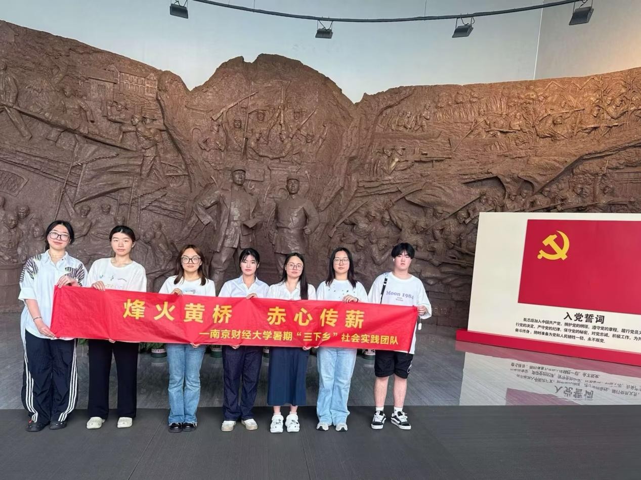八月的黄桥,骄阳炙烤着青石板路,老街上的梧桐叶在热风里轻轻摇曳,街角的茶馆飘出淡淡的茶香,却掩不住这片土地深处沉淀的红色记忆。南京财经大学 “烽火黄桥,赤心传薪——黄桥战役老兵访谈录”实践队,正于8月2日至5日在此开展暑期 “三下乡” 社会实践活动。队员们带着对革命先辈的崇敬,踏着先辈们曾战斗过的足迹,走进黄桥战役纪念馆。当他们的指尖轻轻拂过展厅里的玻璃展柜,目光落在那条边缘磨破、缀着三块整齐补丁的旧毛毯上,落在那张泛黄的黑白合影上,落在那抔装在素色布袋里、来自烈士墓的泥土上时,仿佛瞬间被拉回了八十多年前的烽火岁月。这三件看似寻常的物品,如同三颗串联历史的珍珠,将徐绪奎、刘史明与王必成三位革命战士跨越生死的战友情谊,清晰地铺展在队员们眼前——那是硝烟中结下的生死之交,是岁月里从未褪色的坚守与思念,生动诠释了何为 “岂曰无衣,与子同袍” 的赤诚与担当。