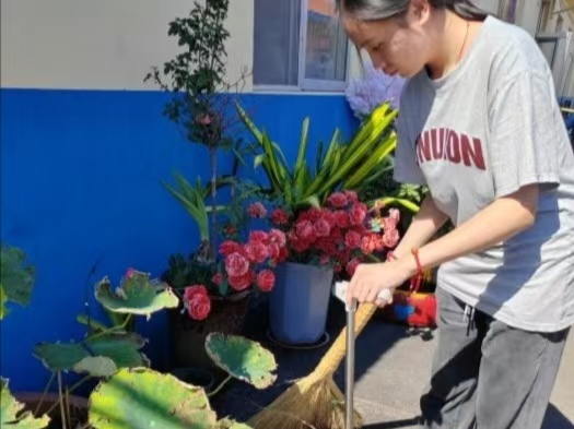 在养老院的小院里,实践团成员正蹲在花坛边,仔细清理着花盆周围散落的垃圾。几片枯落的花瓣混着细小的纸屑藏在泥土缝隙里,她先用小扫帚轻轻扫拢, 不一会儿,原本有些杂乱的花坛周围变得整洁清爽,各色花卉在阳光下更显生机。看着自己的劳动成果,额角的汗珠映着笑意滚落。这看似简单的清扫,不仅擦亮了环境,更在弯腰起身间,传递着年轻人对老人们生活细节的在意。