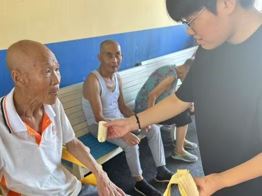 午后,老人们围坐成几排,眼神里带着期待。实践团成员端着盛满香蕉的果盘走过去,想起院长叮嘱的“把皮剥开,掰成一半一半”,大家都格外细心。她先拿起一根黄澄澄的香蕉,指尖轻轻捏住蒂部剥开,金黄的果肉裹着淡淡的清香露出来,小心地从中间掰开,递到张奶奶手里:“奶奶,慢点吃。”李爷爷牙口不好,接过半根香蕉时,笑得眼睛眯成了缝:“这香蕉甜,你们想得真周到。”成员们分工合作,有的负责剥皮掰分,有的挨着座位分发,特意留意着每位老人。看到行动不便的王爷爷没拿到,实践团成员赶紧捧着半根香蕉走过去,轻轻放进他手里。简单的举动里,藏着最实在的温暖。