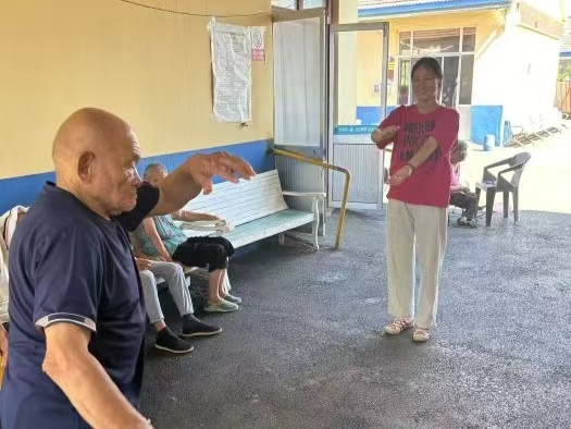 另外,实践团成员们跟着养老院的护工阿姨,带着老人们做起了简易健身操。“来,大家慢慢抬手,左三圈右三圈……”我们一边喊着口令,一边给动作慢的老人搭把手。伸展、弯腰、踢腿,动作简单得很,老人们却做得格外认真,有的还会互相提醒“慢点,别着急”。十五分钟的操做下来,大家额头都见了薄汗,却没人喊累。王爷爷笑着说:“你们来了,这院子里的晨练都比往常热闹!”张奶奶甚至笑着调侃:“你们这操比广播里的简单,咱能跟上!”阳光越发明媚,照在老人们舒展的眉眼上,这清晨的互动,像给一天都镀上了层暖融融的光。