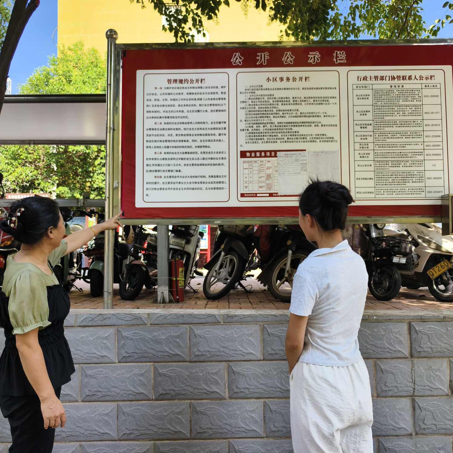 图2 日照市岚山区阿掖山花园社区干部向队员介绍公示栏情况