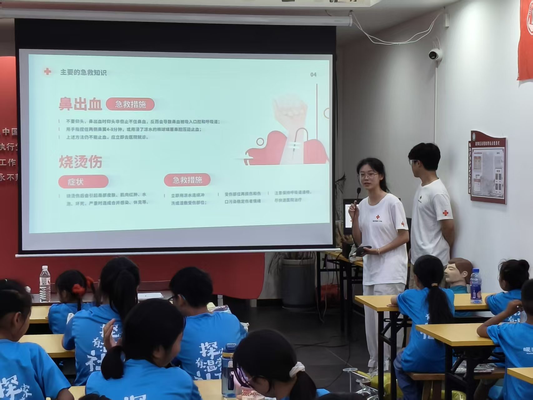 运动减重与急救赋能融合行动 为提升孩子们的安全防护与应急处置能力,成员们为孩子们讲解了健康与急救知识,阐述科学运动与体重管理关系并列举常见运动热量消耗数据,还通过“讲解+演示”教授扭伤处理、心肺复苏等技能,结合运动装备与急救教具让孩子们在互动和模拟中建立健康观念、培养安全意识。