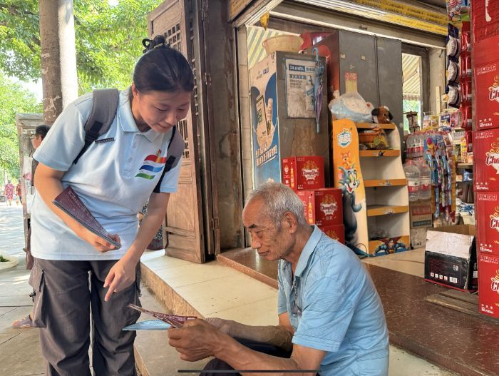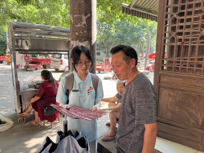 图为实践团成员给居民分发宣传册。毛玉贤供图