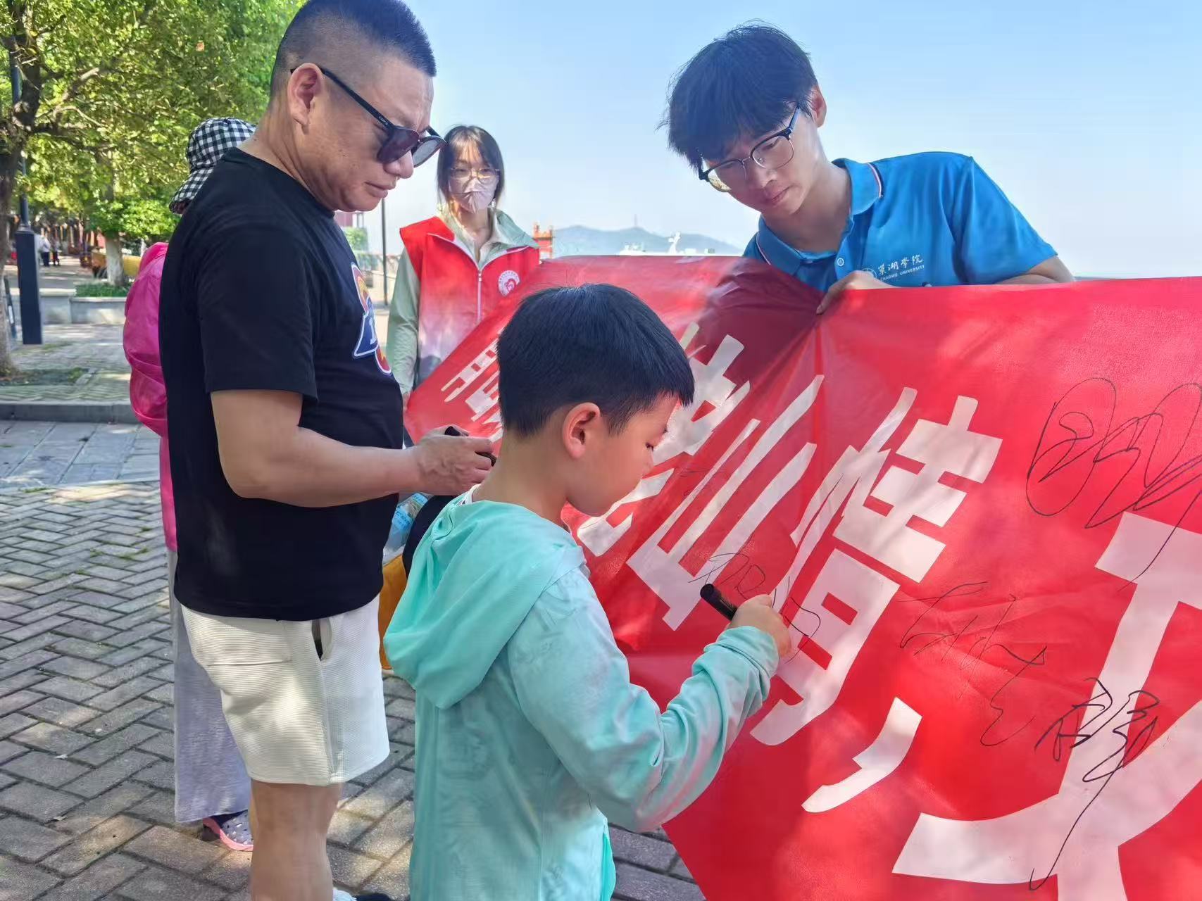 实践途中,“青山绿水姥山情,文明旅游共践行”的主题倡议如一阵清风,拂过姥山岛的游人肩头。实践团成员展起横幅,向往来者细细絮说文明游览的点滴要诀,再递上笔,邀众人以签名为诺。“不污湖面”“敬护古迹”“低语随行”——这些简单的约定,借着笔尖落下的郑重,悄悄在人心间生了根。不少游客抚过签名,轻声承诺要从己身做起,让旅途言行皆合于礼。