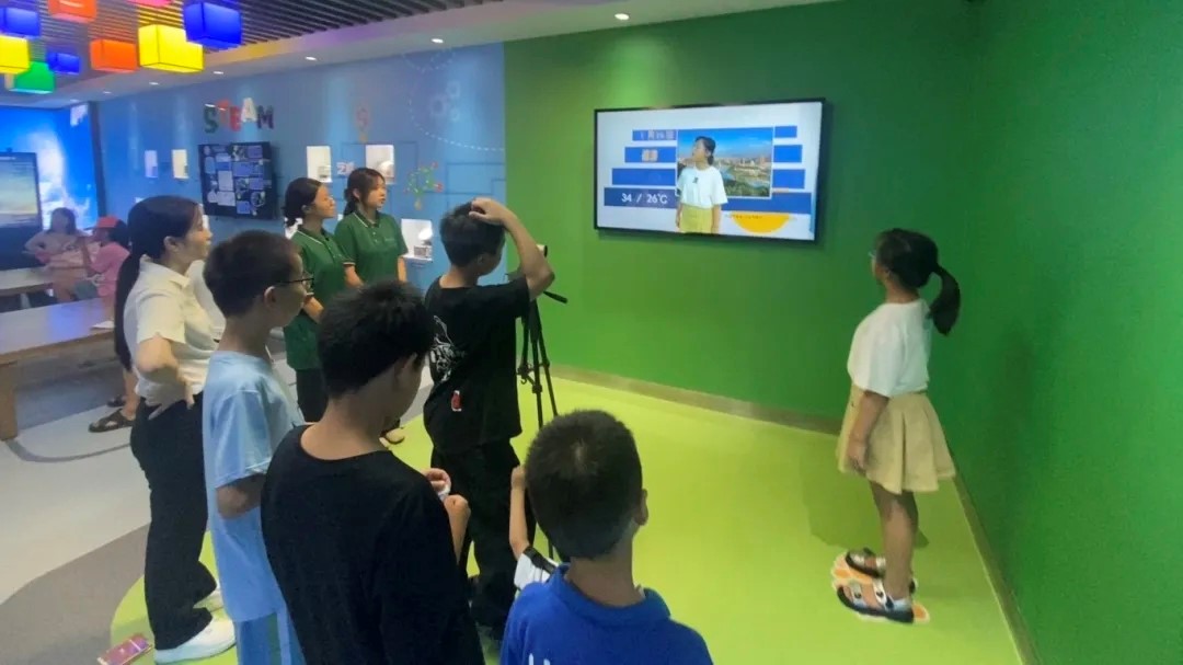 图为“院长妈妈有约”社会实践科普队员指导小朋友进行天气预报。吴羽彤摄