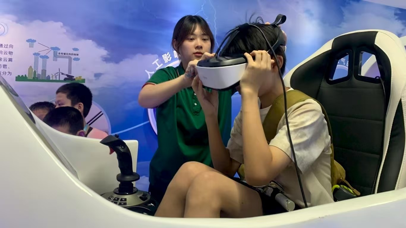 图为“院长妈妈有约”社会实践科普队员帮助小朋友体验人工影响天气VR飞机。唐明烨摄