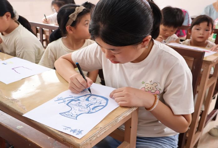 图为陶瓷设计环节中孩子们绘制陶瓷设计图