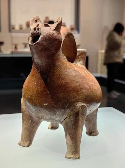 在史前展厅,一件形制独特的陶器让我们驻足良久。这是一件红陶兽形壶,来自距今5000-6000年前的大汶口文化时期。它高21.6厘米,长22.4厘米,夹砂红陶,通体磨光,遍施红色陶衣,光润亮泽。器型圆面耸耳,拱鼻,张口,耳穿小孔,四肢粗壮,短尾上翘。