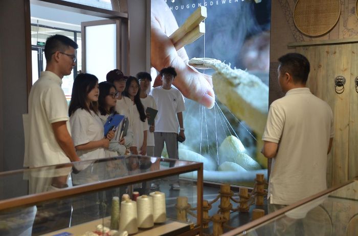 在丝绸公司,同学们走进蚕桑文化馆,聆听丝绸历史讲解,欣赏精美丝绸制品,体验非遗技艺的传承与创新。公司还展示了其人才公寓和员工福利,体现出企业对人才引进的重视与投入。