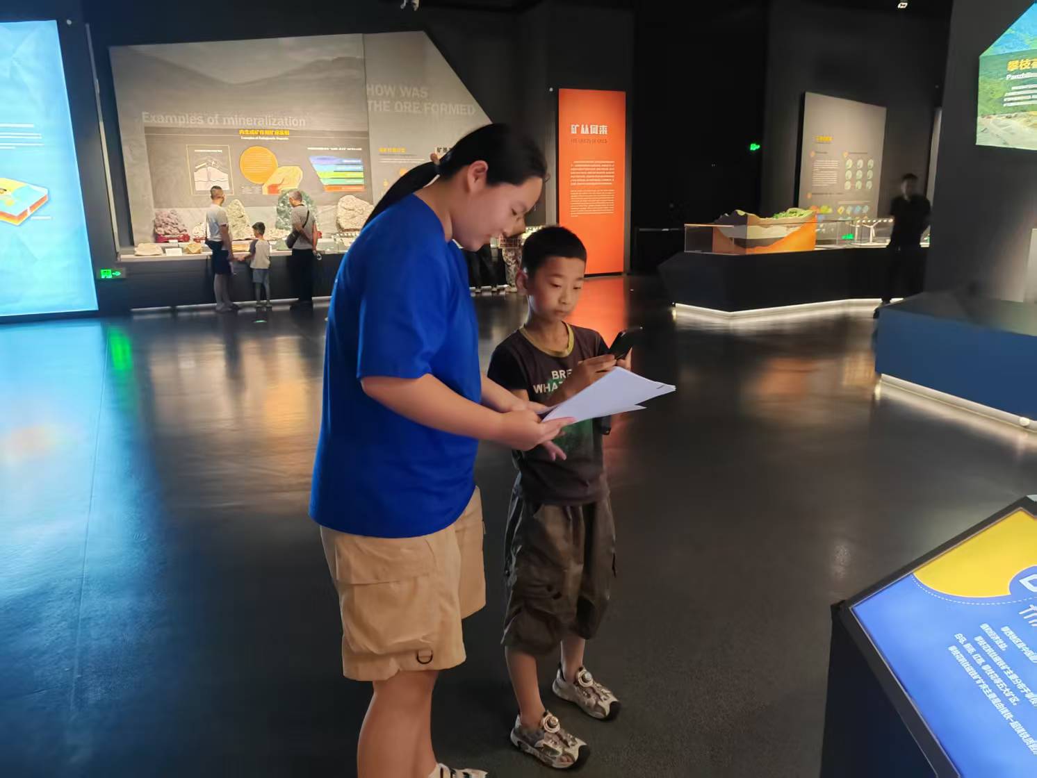 面向孩童群体:团队成员李欣悦蹲下身,用手中的铀矿勘探模型模拟“地质寻宝”,“小朋友们看,这个小锤子就像当年叔叔阿姨用的工具,我们要找到‘藏起来’的铀矿石,才能为国家造‘大国盾牌’哦!”生动的比喻让孩子们围在模型旁,举手提问“矿石怎么变成原子弹”“地质锤重不重”,现场充满好奇与童趣。