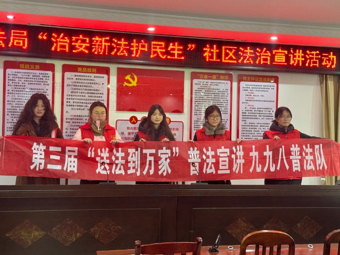 九九八普法队讯(通讯员李慧严青秀)为深入贯彻《中华人民共和国治安管理处罚法》,切实提升社区居民的法治素养与自我保护意识,2月5日,湘潭大学“送法到万家”普法宣传志愿者团队走进恩施市五峰山社区,开展“新修订治安管理处罚法”主题宣讲活动。大学生宣讲员刘晨璐担任主讲人,为现场社区居民带来了一堂生动且实用的法治教育课。
