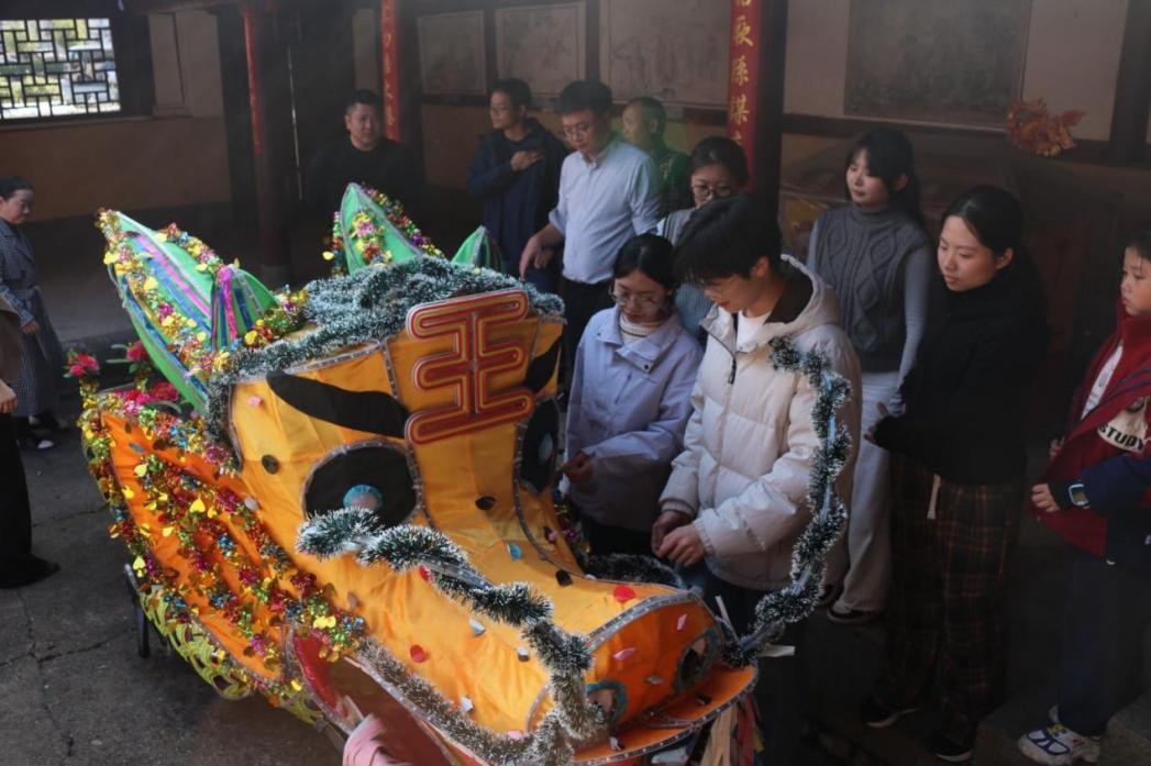 探寻非遗文化,实践队赴均溪镇闽中戏曲文化园,实地探访国家级非物质文化遗产“大田板灯龙”。据介绍,大田县至今仍有约80个村落延续着游龙迎灯的习俗。“迎灯”谐音“迎丁”,承载着村民对家族兴旺、子孙延绵的美好祈愿。随后,实践队来到温镇村,近距离观摩板灯龙的制作过程。从扎制骨架到彩绘装裱,每一步都凝聚着手艺人的匠心与专注,让队员们感受到非遗技艺背后代代相传的坚守与热爱。