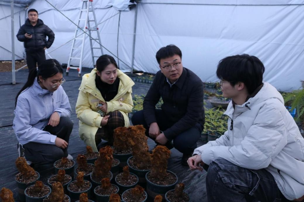 青山绿水育良药,中药材产业开出“致富良方”。在谢洋乡大仙峰自然保护区内,金毛狗蕨种植基地已初具规模,成为当地中药材产业的一处亮点。实践队深入田间地头,结合药学专业知识,围绕金毛狗蕨的生长习性、品种选育、生态种植与市场拓展等,与基地负责人展开交流,并提出了一系列贴合当地实际的发展建议。
