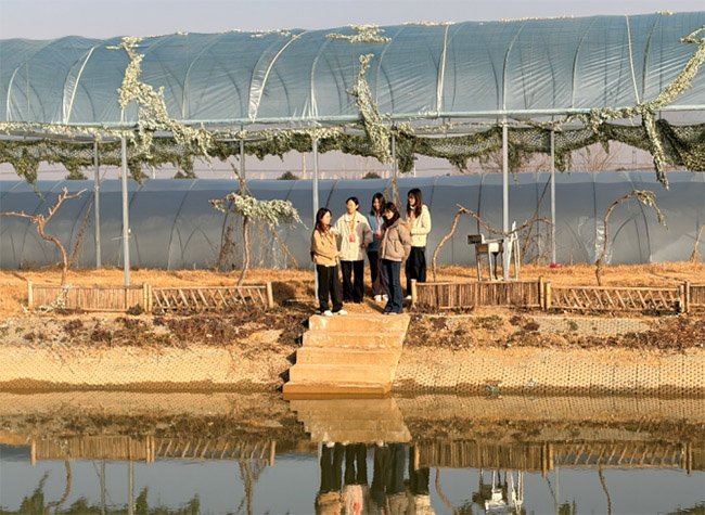1月15日上午9点,团队抵达定庵村耘耕生态农场,对农田、鱼塘、温室大棚等农场建设进行实地调研。耘耕生态农场位于蚌山区燕山乡定庵村,是由村集体主导,以绿色生态种植为核心,融合农事体验、研学实践、农文旅休闲等业态的乡村振兴与生态农业融合发展的示范项目。