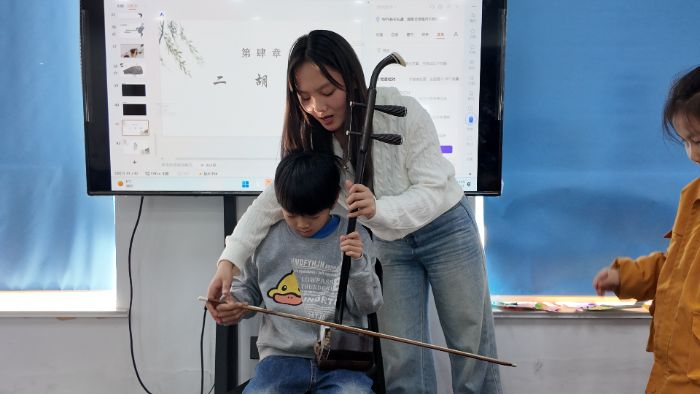 下午的时光,在传统文化的浸润与欢声笑语中展开。按照课表安排,支教团志愿者带来了“中国传统乐器大赏”美育课。结合自身专业特长,志愿者们用浅显易懂的语言,介绍了拉弦、弹拨、吹管、打击四大类传统乐器,还播放了经典曲目片段——二胡的悠扬、竹笛的婉转、锣鼓的铿锵,让孩子们直观感受传统乐器的魅力。最让孩子们期待的是乐器体验环节,志愿者拿出随身携带的二胡,手把手教大家握弓、运弓的基本姿势。当孩子们拉出第一个简单的音符时,课堂里瞬间响起热烈的掌声。志愿者还带来了快板、木鱼等简易乐器,让孩子们分组体验,在亲手演奏中,传统文化的印记深深烙在了孩子们心中。