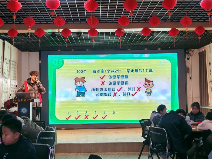 课堂伊始,张宇翔同学以趣味互动开启教学,接连抛出“十枚棋子每次取1或2枚谁能取到最后一枚获胜”“二十枚棋子改变取棋规则该如何制胜”等问题,瞬间点燃孩子们的探索热情。大家纷纷举手抢答,现场沉浸在热烈的思考与讨论氛围中,从最初的盲目尝试,逐渐开始尝试寻找背后的规律。针对孩子们的探索结果,张宇翔同学顺势展开讲解,以100枚棋子每次取1或2枚的经典题型为核心,引导孩子们发现取棋游戏中的“3个周期”规律,通过100÷3=33……1的简单计算,让孩子们理解先取1枚再始终与对手凑3枚的必胜技巧,将数学计算与策略思维巧妙结合。